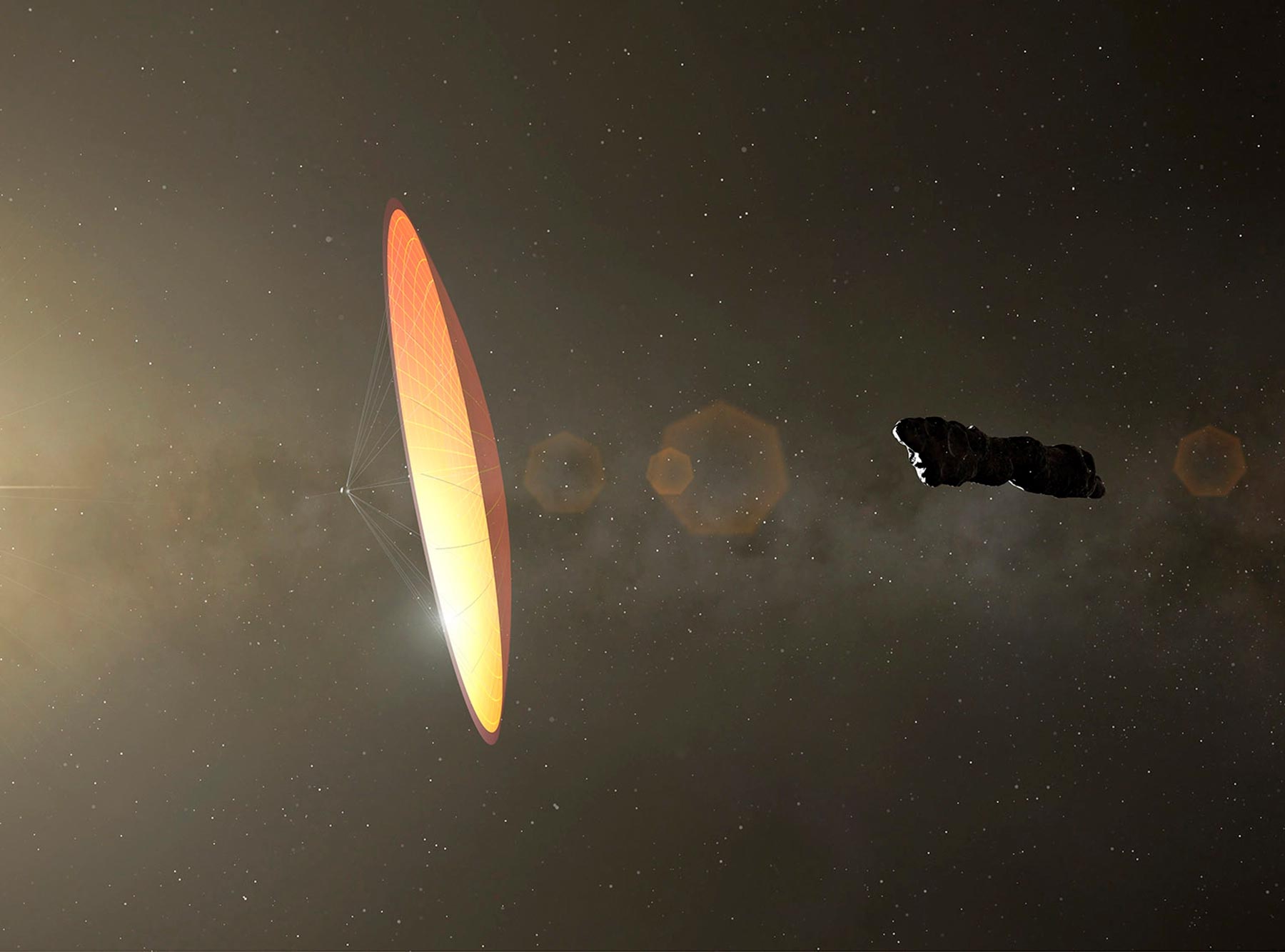 “Kami menjelaskan percepatan berlebih `Oumuamua menjauh dari matahari sebagai akibat dari gaya yang diberikan sinar matahari pada permukaannya. Agar gaya ini dapat menjelaskan percepatan berlebih yang terukur, objek tersebut harus sangat tipis, dengan ketebalan sekitar sepersekian milimeter tetapi berukuran puluhan meter. Hal ini membuat objek tersebut ringan untuk luas permukaannya dan memungkinkannya bertindak sebagai layar cahaya. Asalnya bisa alami (di medium antarbintang atau cakram protoplanet) atau buatan (sebagai wahana yang dikirim untuk misi pengintaian ke wilayah dalam tata surya).”